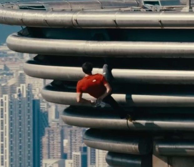 霍諾德在攀爬多層圓柱體時,讓無數觀眾心臟快跳出來,霍諾德雙手放開,僅靠雙腳夾住建築物,下一秒雙手往身後的袋子裡抹粉。