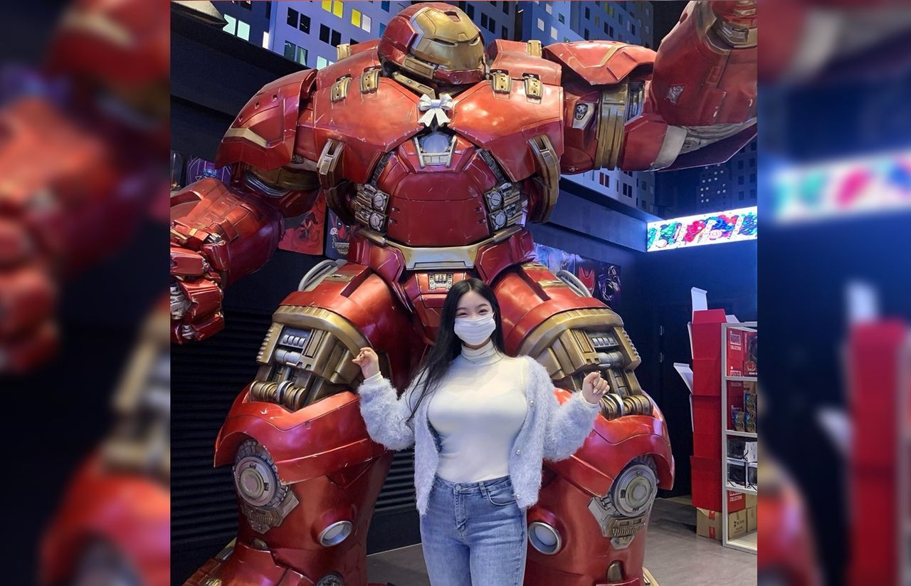 臉書粉專「JKF紅燈區2.0」PO出該張照片。照片顯示,一名戴著口罩的長髮女子站在漫威鋼鐵人「浩克毀滅者」的1比1模型前方開心舉起手合照。其中,鋼鐵人胸口的小領結也意外吸引網友注意。