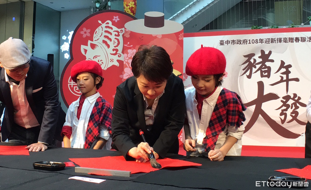 台中市政府108年迎新揮毫21日於新市政大樓、豐原陽明大樓登場,邀請150位書法名家為民免費寫春聯、畫年畫。台中市長盧秀燕也親寫「吉」字,承諾未來4年一定認真拚經濟,並發送「豬年大發」春聯;另春節小紅包,將於大年初一起於各大宮廟定點發送。