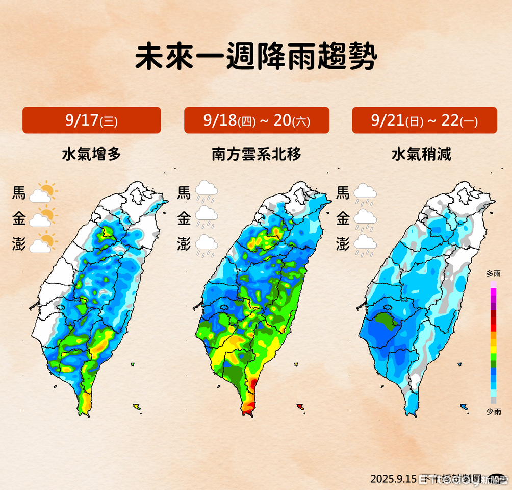 他指出,周四至周六是未來一周降雨最多的幾天,南方雲系北移,各地易有短延時強降雨,周四及周五台東及恆春半島更是整天都有局部大雨,南部及宜花地區也是整天有短暫陣雨,各地午後都有大雨等級降雨。下周日至周一水氣減少,僅東半部及恆春半島有局部短暫雨,其他地區多雲到晴,午後有雷陣雨。