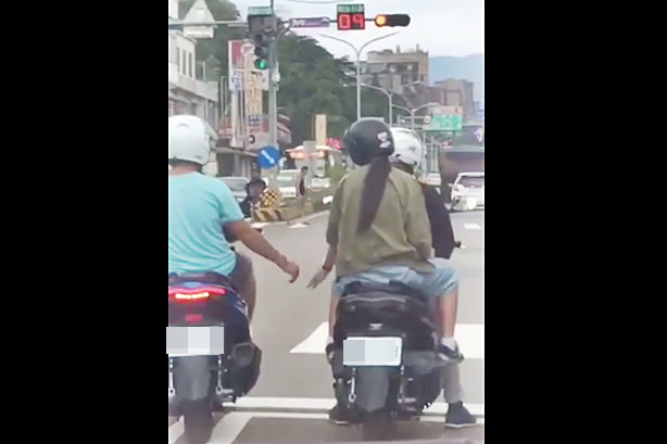 「手在幹嘛嗄~!」有駕駛停等紅燈時,遇到前方一名藍衣騎士,伸出右手不斷波動,靠近旁邊的另一輛雙載機車,沒多久,隔壁騎士竟不顧後方女乘客,跟著一起舞動手臂,看起來就像在回應示愛一般,看得駕駛哈哈大笑。影片被轉PO上臉書,2萬多人高喊「在一起」,還意外引發舞友熱烈討論「不懂Dancer的苦!」
