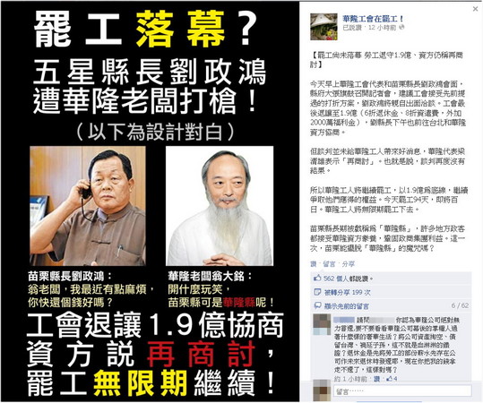 另外,「華隆工會在罷工!」臉書專業昨天也張貼一張「五星級縣長劉政鴻遭華隆老闆打槍」的圖片,除了酸苗栗縣長期被戲稱為「華隆縣」外,也對於工會已經打折改求1.95億,資方仍表示再商討,宣示罷工將無限期繼續。