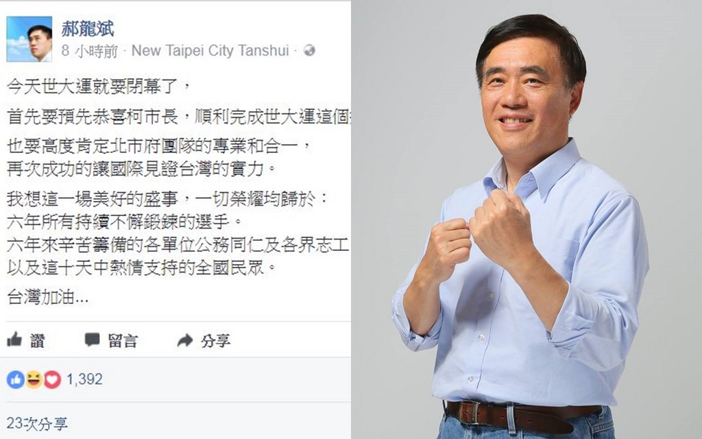 前台北市長郝龍斌30日在臉書PO文,針對2017台北世大運閉幕式,恭喜台北市長柯文哲,順利完成世大運這個挑戰,他說:「高度肯定北市府團隊的專業和合一,再次成功的讓國際見證台灣的實力。」、「我想這一場美好的盛事,一切榮耀均歸於:六年所有持續不懈鍛鍊的選手。六年來辛苦籌備的各單位公務同仁及各界志工以及這十天中熱情支持的全國民眾。台灣加油!」