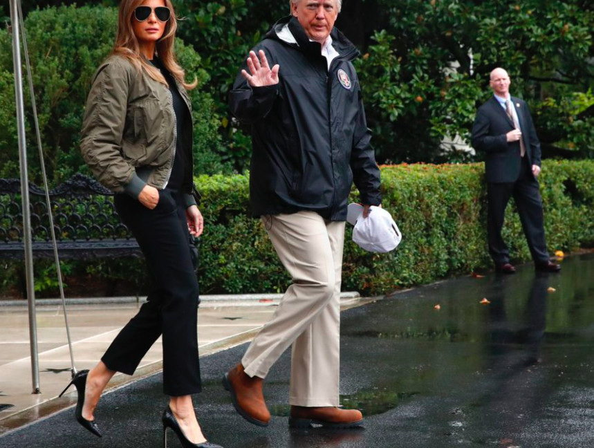 哈維颶風重創美國德州,總統川普在當地時間29日巡視災區,第一夫人梅蘭妮亞(Melania Trump)卻被拍到要登上「海軍陸戰隊一號」時,蹬著一雙黑色細跟高跟鞋。畫面曝光後隨即被網友罵翻,「她看起來就像個要去看熱鬧的芭比娃娃」、「搞什麼!梅蘭妮亞竟然穿4吋高跟鞋去淹水的災區」。《華盛頓郵報》也批評,梅蘭妮亞知道自己登機時會被拍,所以從頭到腳都要保持完美,連陰天還要戴墨鏡,顯然認為時尚比災民重要。