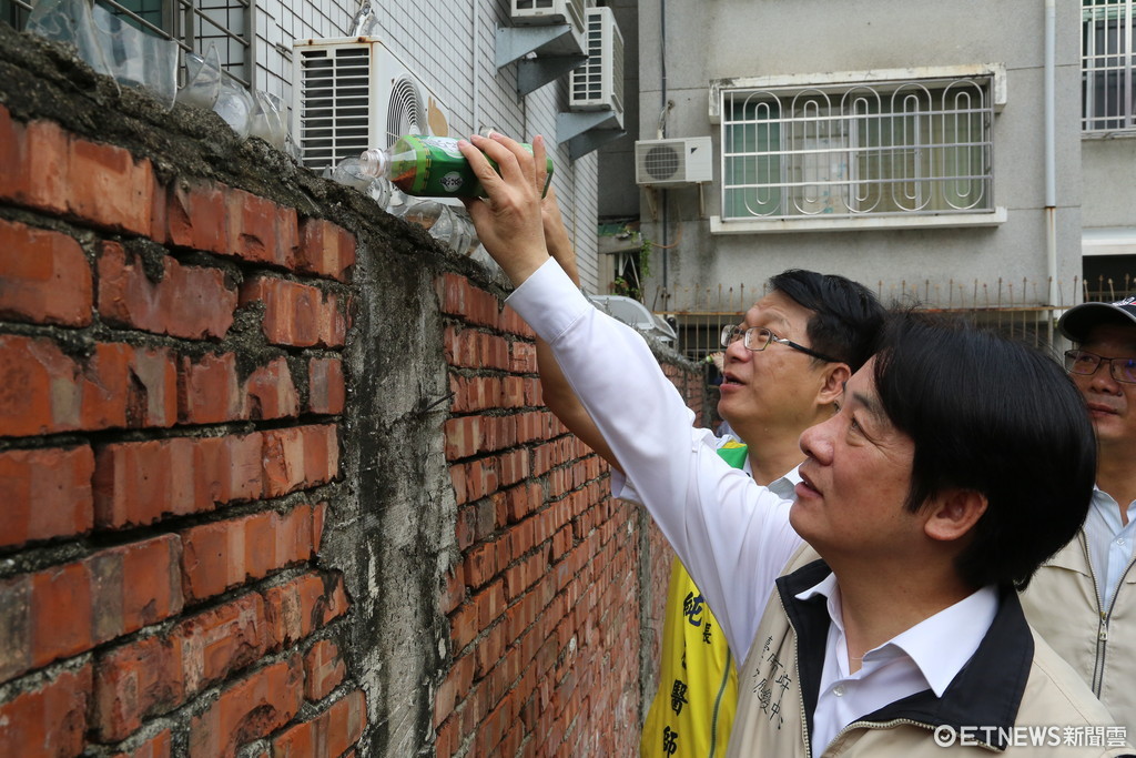 廢棄房舍的圍牆,過去因防盜的因素,在牆上都加上尖銳的玻璃,賴清德市長和國衛院登革熱首席防疫宣導專家顏純左,發現牆上玻璃的凹陷處有積水,擔心雨季後這看不見的盲點孳生病媒蚊,賴清德與顏純左現場即在牆上施藥,避免產生孓孑後再產出病媒蚊的狀況,賴清德並指示必須要把圍牆上的玻璃剷平,以杜絕後患。