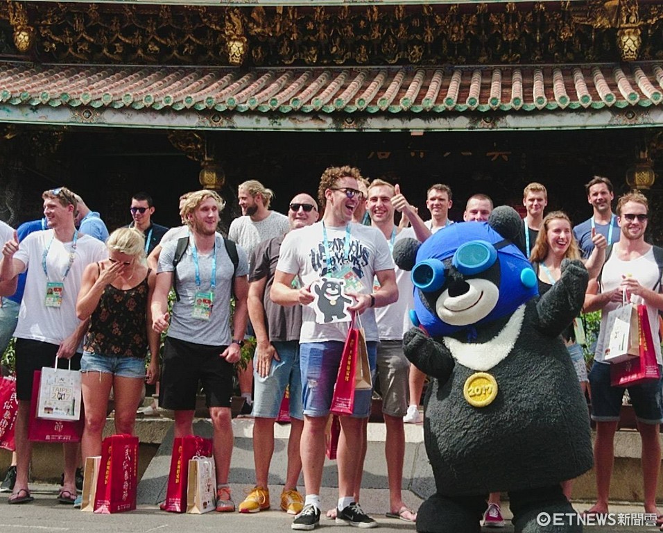 頭戴蛙鏡、泳帽造型的熊讚一現身,隨即引發荷蘭水球代表隊一陣騷動,紛紛搶著要和熊讚合影、自拍,而熊讚也發揮人來瘋本色,與選手玩成一塊。