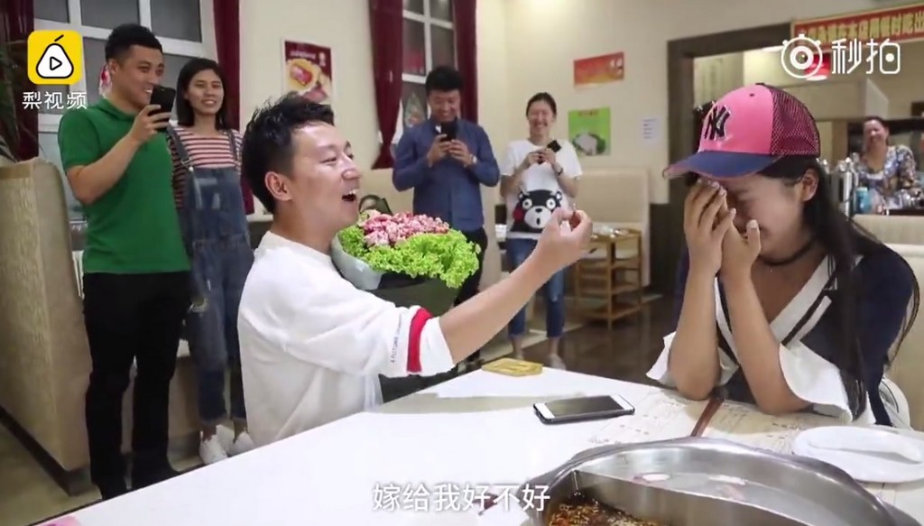 吉林長春上月27日一家火鍋店上演「牛肉花束求婚」戲碼,求婚男子穆思堯手捧著滿滿生菜與牛肉的「花束」,還從中掏出戒指,向女友王語琪說「我覺得我應該把這一份屬於你的幸福送給你。」讓女友摀著嘴笑不停,害羞點頭。