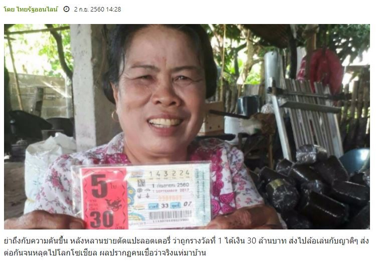 事件主角鸞女士一張手持中獎彩券的照片近日在泰國網路瘋傳,不僅鸞女士,連街坊鄰居和網友也都信以為真。據《泰叻報》報導,鸞女士的丈夫巴勇表示,原本是因為他們的孫女吵著想要買摩托車,一家人便隨口對她開玩笑說,如果這次中了頭獎就買給她。