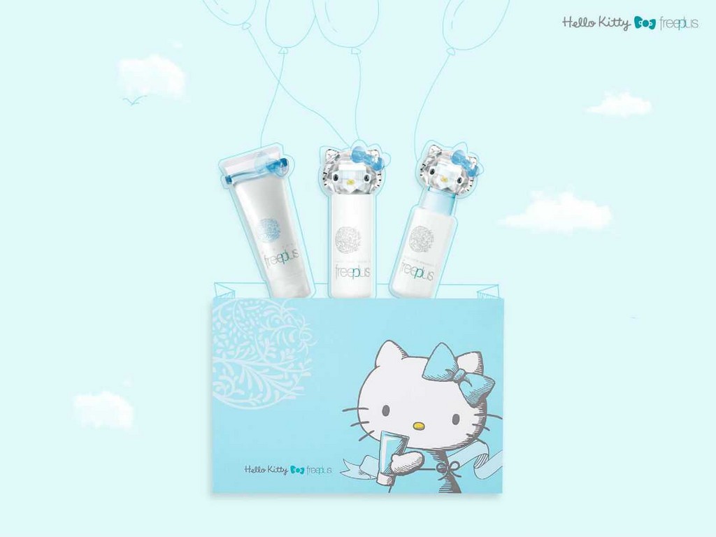 開架醫美品牌「freeplus」於2017年1月正式登台,於屈臣氏獨家販售,主打低刺激高保濕配方,甫推出就受到眾多使用者支持,於敏弱肌市場站穩腳步。這次和Hello Kitty聯手推出限量保養禮盒,配合freeplus一貫的低刺激溫合理念,禮盒上的Hello Kitty也以柔和療癒的水藍造型登場,讓人愛不釋手的可愛設計,上市後勢必引起一波收藏搶購風潮。