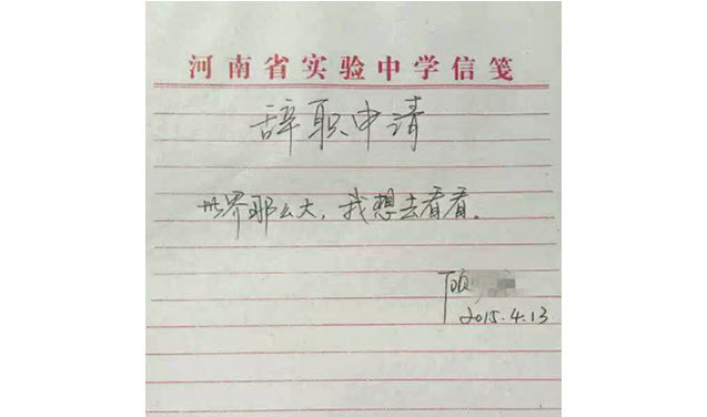 兩年前大陸河南鄭州一名中學老師顧少強,以一封霸氣辭職信「世界那麼大,我想去看看」,瀟灑地寫下10個大字,很多網友都說這是「史上最具情懷辭職信」,牽動了無數上班族的「尋夢心」。事隔兩年,有陸媒透露,這名老師根本沒有出國。