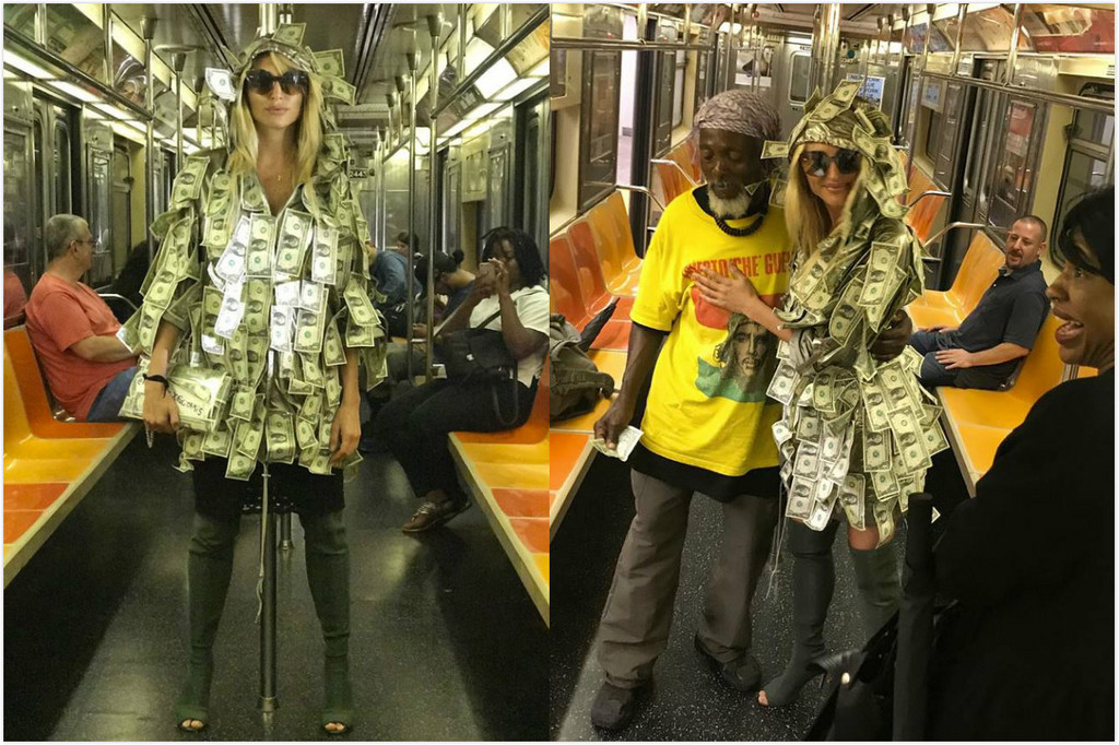 綜合外媒報導,31歲的維多利亞全身貼滿紙鈔,到紐約地鐵發錢,鼓勵有需要的人和人都能來拿取。她說,「我到過很多地方旅行,很久以前我就告訴自己,我一定要在紐約做這件事,最後選擇地鐵,因為這個地方是整個城市最窮的地方,穿著紙鈔裝,讓人們可以抓住需要的東西。」