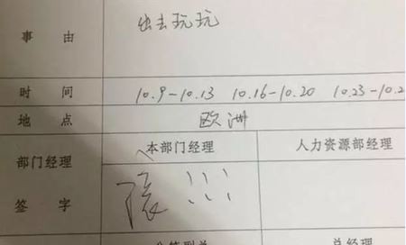 根據《杭州網》報導,杭州男分別請10/9-10/13、10/16-10/20、10/23-10/27,再搭配上十一假期與周休二日,就能連續放29天的假,想好好到歐洲深度之旅,沒想到只得到部門主管霸氣「一字回覆」,左思右想上面的字像是「浪」,上網PO文寫上「準備10月請假出去玩,今天請部門老大簽字了。可是......誰能幫我認一下,老大是不是說我浪?」