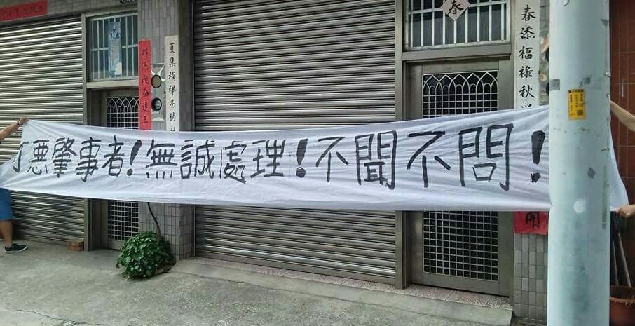 ▲存錢4年開飲料店養家卻送命!家屬拉布條抗議。(圖/翻攝伸港小鎮臉書社團)