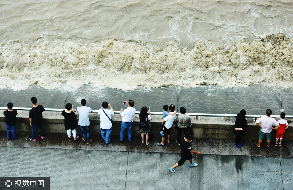 浙江省錢塘江大潮是天下奇觀之一,因為浪高、兇猛又驚險而出名,8日適逢觀賞錢塘江「鬼王潮」的最佳時機,震撼的場面吸引許多民眾、遊客爭相擠在岸邊觀浪,欣賞一年一度的壯闊江水。
