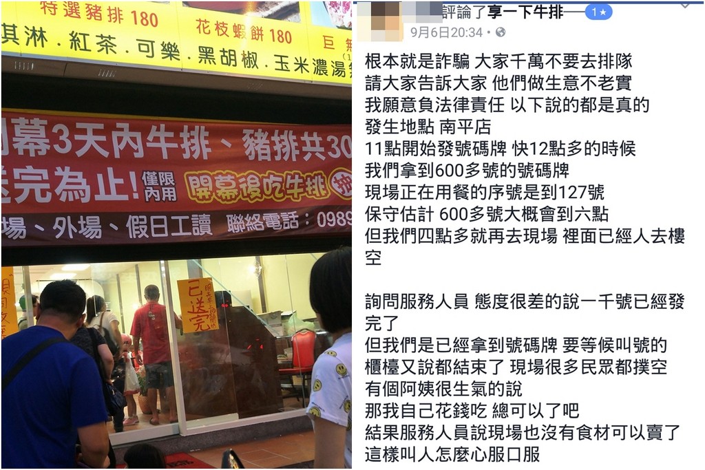 原來有女客人當天領了號碼牌後,隔了很久才回來,因過號吃不到免費牛排,一氣之下報了警,還鼓譟其他客人,告老闆詐欺。老闆無奈地說,現在雖然客人比較少了,但也比較不會造成隔壁店的困擾,「之前差不多11點開門,11點10分就客滿,外面還有近百人在排隊,要吃最少也要等一個小時。」