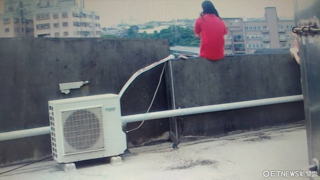 ▲紅衣女跨坐在頂樓矮牆,欲跳樓輕生。(圖/記者林煒傑翻攝)