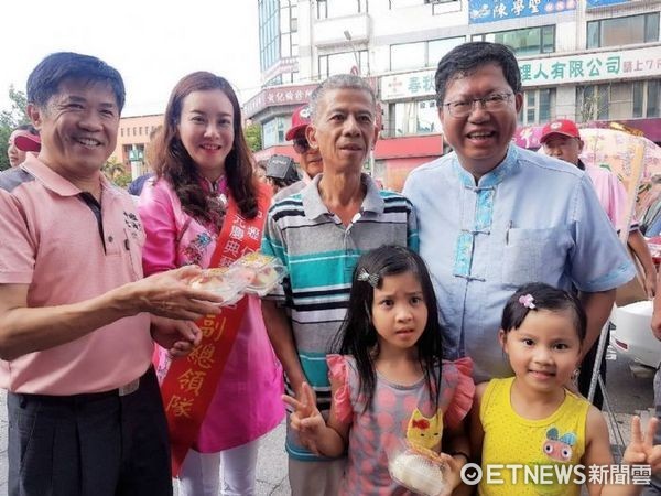 ▲市長 鄭文燦參與遶境並發放「平安豬」造型饅頭給小朋友。(圖/桃園市政府提供)