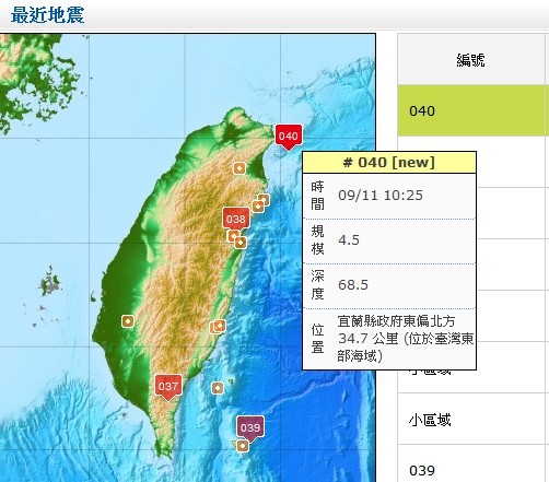 地牛翻身!今天上午10時25分宜蘭縣政府東偏北方 34.7 公里 (位於台灣東部海域)發生芮氏規模4.5地震,地震深度68.5公里,台北市南港地區明顯感受到一陣搖晃。各地最大震度為宜蘭3級、新北市、花蓮縣2級、台北市、新北市、桃園市、花蓮、新竹縣、彰化縣等1級。