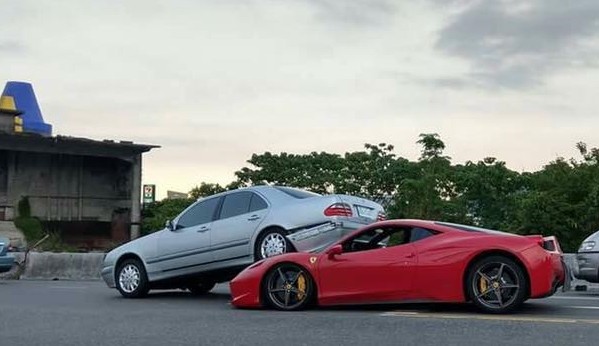 宜蘭蘇澳交流道下方11日傍晚發生一起離奇的追撞車禍。當時一輛價值千萬的紅色法拉利458 Italia超跑下交流道時,疑似車速過快、反應不及,直接撞上前方煞車的銀色賓士,還將對方從後直接「鏟起」,狠狠卡進車尾,奇特景象讓路過民眾全都看傻了眼。