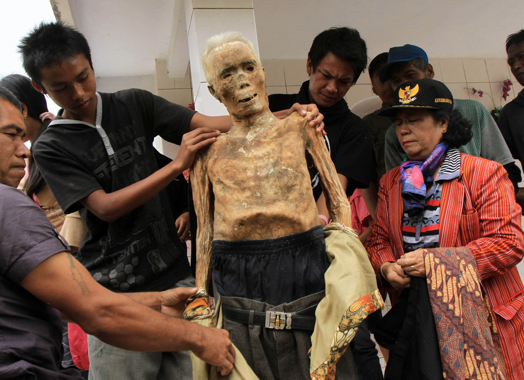 蘇拉威西島上的托拉雅(Toraja)族人每年8月都會舉行「趕屍」儀式,先將親人遺體從墳中挖出,再穿上漂亮的新衣服,順便修補棺木的腐蝕處,接著透過特殊儀式,讓亡者在村內「站著」列隊遊行,如同開派對一般,希望死去的親人能再度與他們團聚。