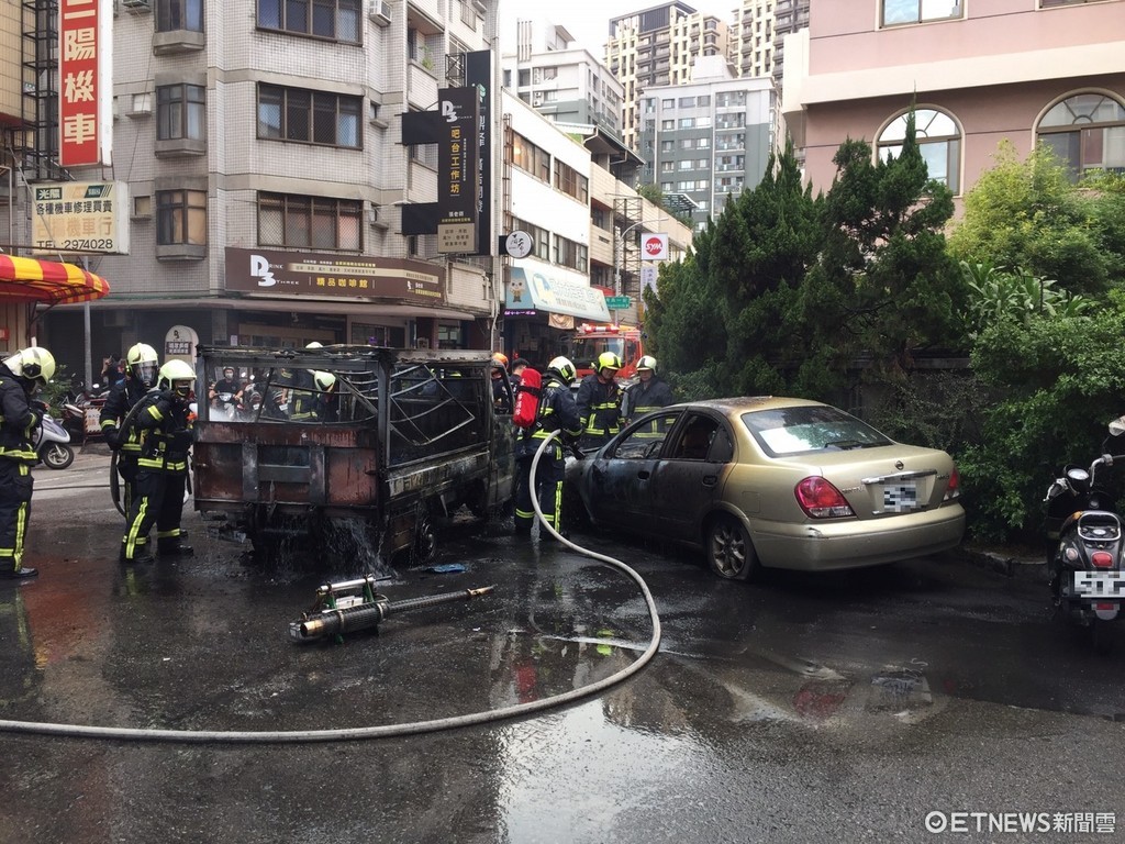 ▲台中青島路一段小貨車無故自燃,火勢波及鄰近自小客車。(圖/記者莊智勝翻攝,下同)