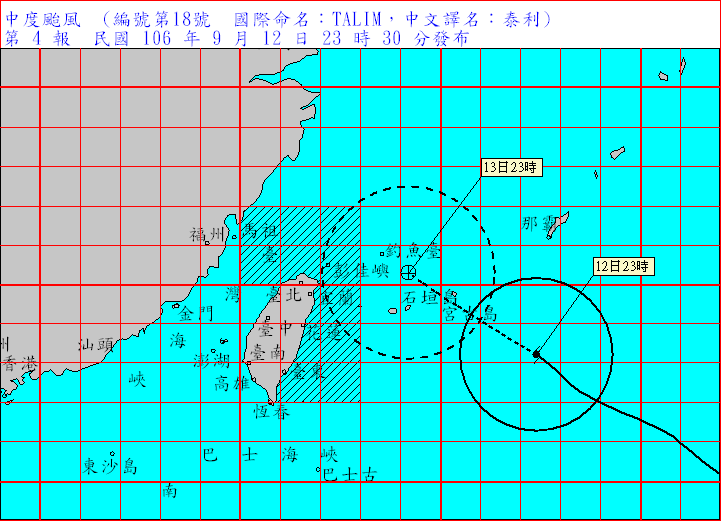 由於太平洋高壓又稍微減弱,泰利在接近台灣東北部海面的過程,速度將減慢,因此,陸警預估延後至13日清晨5時30分發布。羅雅尹補充,接近過程中導引氣流的些微變化,颱風路徑可能再偏東或偏北,也不能完全排除暴風圈不接觸台灣陸地,有不發布陸警的機會。