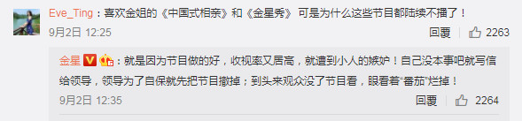 已經停了一段時間的「金星秀」主持人金星,也在8月30日於個人微博寫道,「親愛的觀眾朋友們:謝謝你們一直以來對金星秀 的支持和愛護,我們後會有期!」有網友詢問停播原因,金星回覆表示,「就是因為節目做的好,收視率又居高,就遭到小人的嫉妒!自己沒本事吧就寫信給領導,領導為了自保就先把節目撤掉。」