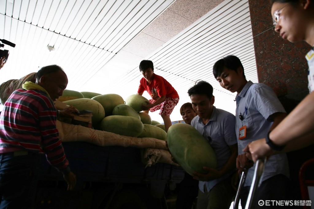 兩卡車的西瓜停在醫院大門口,平常用來送運藥品或餐點的推車,頓時間成了西瓜搬運車,各單位派出同仁協助瓜農將西瓜搬下車,小心翼翼的平放在大廳角落,西瓜農蔡永順與兩位孫子邊搬西瓜,開心的說:真的很謝謝醫生的幫忙,實在是揪感心!