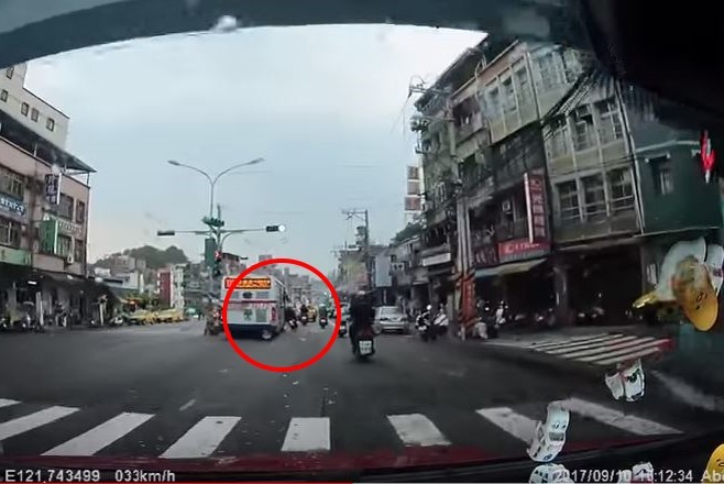 曾姓網友在「爆料公社」PO出一段僅14秒的行車紀錄器影片,並表示,「為什麼騎車要這麼外面?差一點就……。」影片中,只見一輛公車平穩行駛在基隆市仁愛區南榮路內線車道,剛經過紅綠燈就和一名騎在內車道邊緣的機車騎士發生擦撞,嚇得後方駕駛一邊連飆好幾聲「幹」一邊急踩煞車。