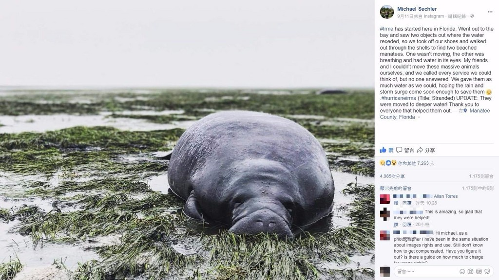 美國佛羅里達州遭到颶風艾瑪(Irma)肆虐,有遊客拍下在薩拉索塔灣(Sarasota Bay)被困住的兩隻海牛,可愛又無助的模樣吸引大批網友轉發,事後這張照片也被多家媒體引用,沒想到拍下這張照片的麥可(Michael Sechler)卻一毛版權費都沒拿不到。