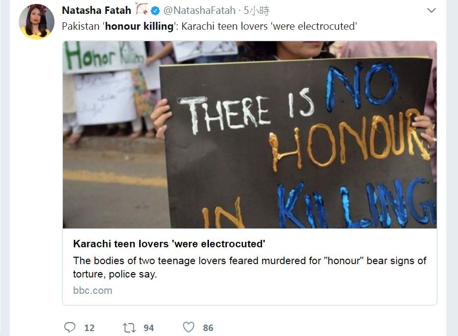 ▲巴基斯坦的「榮譽殺戮」數量正在增加。(圖/翻攝自Natasha Fatah推特)