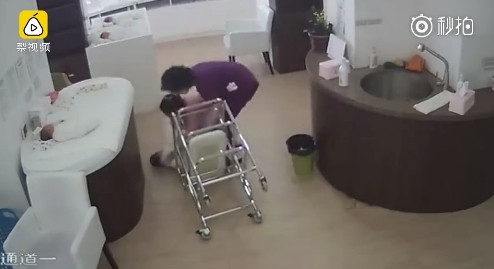 綜合大陸媒體報導,事發於7月16日,在以「國際護理師」作招牌、號稱是「韓資月子中心」的婦嬰保健公司,一名中年女職員將放有初生嬰兒的護理車推前又拉後,接著她將護理車大力推送給另一位女同事,但過程中護理車翻倒,嬰兒應聲落地,她嚇了一跳,立刻上前推開已經抱起嬰兒的女同事,自己抱回嬰兒。