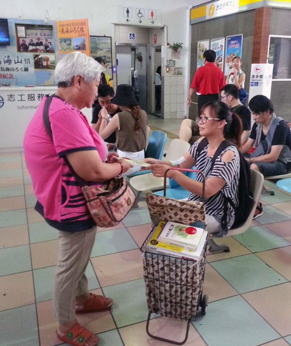 買完菜的黃素娥阿嬤,依循往例推著菜籃車到圖書館裝滿書,然後到瑞芳火車站補書、向大家推薦書,2年來,她雖然推壞了菜籃車,但卻送出了上千本書。即使最近阿嬤因瘠椎問題導致雙腿疼痛、行動不便,需要到醫院復健,阿嬤仍會利用復健之餘的時間抽空到車站「送書」(圖/新北市立圖書館瑞芳分館提供)。