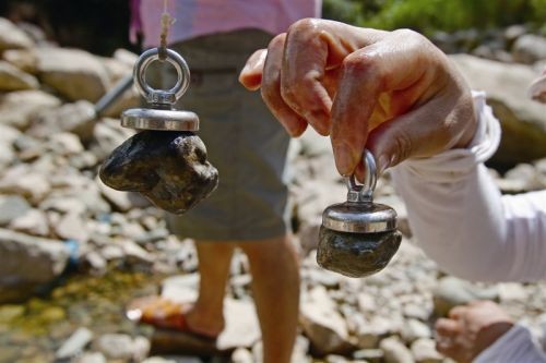 來自台州黃岩的陳先生表示,自己帶了2個朋友來淘石頭,而帶他來的是台州溫嶺一名對石頭非常在行的「師傅」。此外,陳先生一行人手裡都拿著一塊磁鐵,只要看到「疑似」的石頭,就會用磁鐵吸吸看,如果能夠吸住,就有可能是「黑金石」。