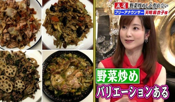 天明麻衣子在節目《有吉反省會》時,自爆結婚3年,每天都給老公吃炒青菜,因為這樣最省時間、又有效率;此言一出,讓現場來賓傻眼,主持人更忍不住問,「以為妳東大畢業,又長這麼漂亮,一定很會做菜,怎麼只會炒青菜呢?」