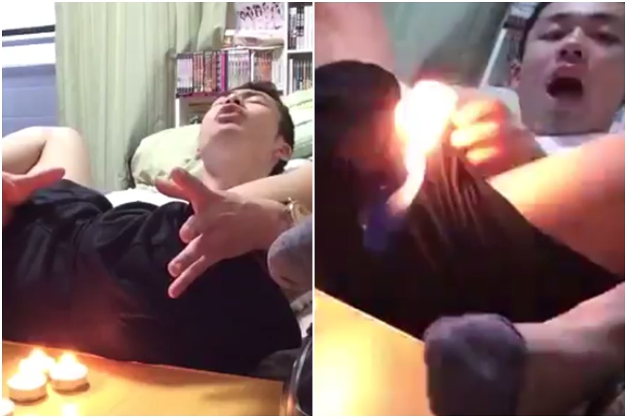 失敗幾次後,網友的「屁氣」終於來了,就把屁股對準蠟燭,沒想到竟然發生「意外」,他不但沒有把蠟燭吹熄,反而透過屁氣點燃了火,火就瞬間沿著他的褲子燃燒,讓他嚇得趕緊用手大力拍屁股,熄滅褲子的火焰。