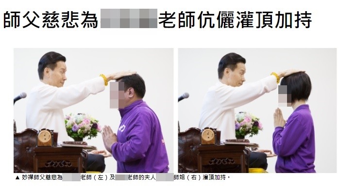 佛教如來宗官網刊登的「禪行週報」2015年某期中,「妙禪師父慈悲開示,為XXX老師伉儷灌頂加持」,只見分局長與妻子雙手合十,虔誠地跪在妙禪跟前,雙眼緊閉接受師父以手摸頭的「佛法灌頂」,讓一旁的其他信徒們相當羨慕。妙禪還以該位分局長為例,表示他剛入門時並不相信師父,但隨著修行進而開悟,逐漸升起對師父的「大信」。