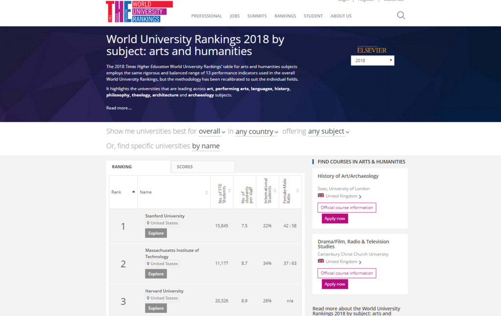 THE每年發表的年度世界大學排名,獲評為全球最具影響力的大學排行榜之一,以教學、研究、國際化程度、論文引用率等13項指標,對全球400所大學的藝術、表演藝術、語言、歷史、哲學、理論、建築等藝術暨人文學科進行評比。