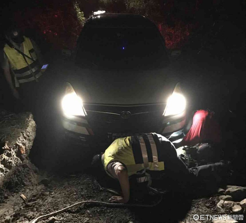 警方說,9月9日17時48分許,玉井分局玉山派出所接獲通報,簡姓民眾與蕭姓友人共同駕車,行經關山里往高雄市那瑪夏產業道路,因道路坍方,天雨路滑,車輛卡在山壁無法動彈,情況危急,警員吳明燁獲報後立即與報案人簡男聯繫,詢問正確位置,並與所長涂瑞峰趕往現場,發動關山里社區巡守隊沿路搜尋。