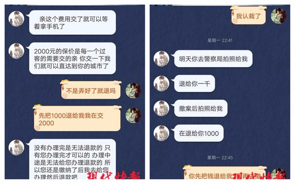 錢姓男子之後受到詐騙集團的各種引誘,又再匯出了1000至3000元人民幣不等的各種款項,總共匯出了3688元,但卻遲遲拿不到手機,只好於11日報警處理。在報警後,他機智向歹徒表示,「先返還1000元,我就撤案」,隨後順利收回。