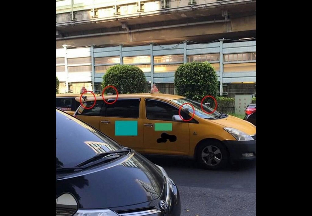這張照片顯示,只見這輛小黃的擋風玻璃兩側各裝一支監視器向後拍,且車尾還有另外兩支監視器向前拍。車外前後總共裝了4支監視器,讓PO照的網友笑說「乘客壓力會不會太大?」