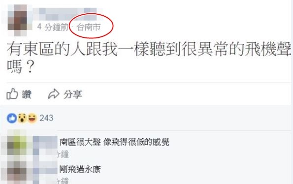 臉書社團《台南諸事會社》、《我在歸仁的大小事》等社團,網友紛紛PO文詢問說,「有東區的人跟我一樣聽到很異常的飛機聲嗎?」、「剛剛是不是有戰鬥機飛過去?還是我幻聽了?」,疑似是有數架戰鬥機、直升機低空飛過市區,進而發出相當巨大的聲響,還有民眾目擊裝甲車也出現在路上行駛。