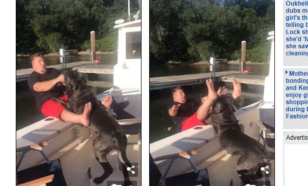 影片中,身穿黑色上衣、紅色褲子的狗主人,站在船邊拿著零食,旁邊還有2隻相當「飢餓」的愛犬,不斷引誘狗狗來吧,邊把手抬高,沒想到反被毛孩捉弄,興奮一撲把他推落水中。2隻愛犬發現主人跌落水中,焦急得趴在船沿查看,跟著主人移動步伐,此舉是關心主人還是查看零食下落,就不得而知。