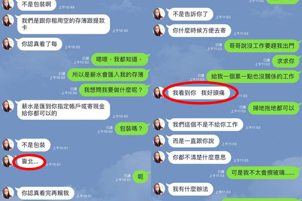 從對話中可以看到,詐騙成員以「租用存簿跟提款卡」為由,希望能誆騙男網友的身分做人頭帳戶,還說「每五天就有一期薪水」,但男網友卻不斷裝傻跳針:「我要應徵禮盒包裝員」、「拜託給我工作」、「包裝什麼東西呢」、「我哥哥要我工作」等語。