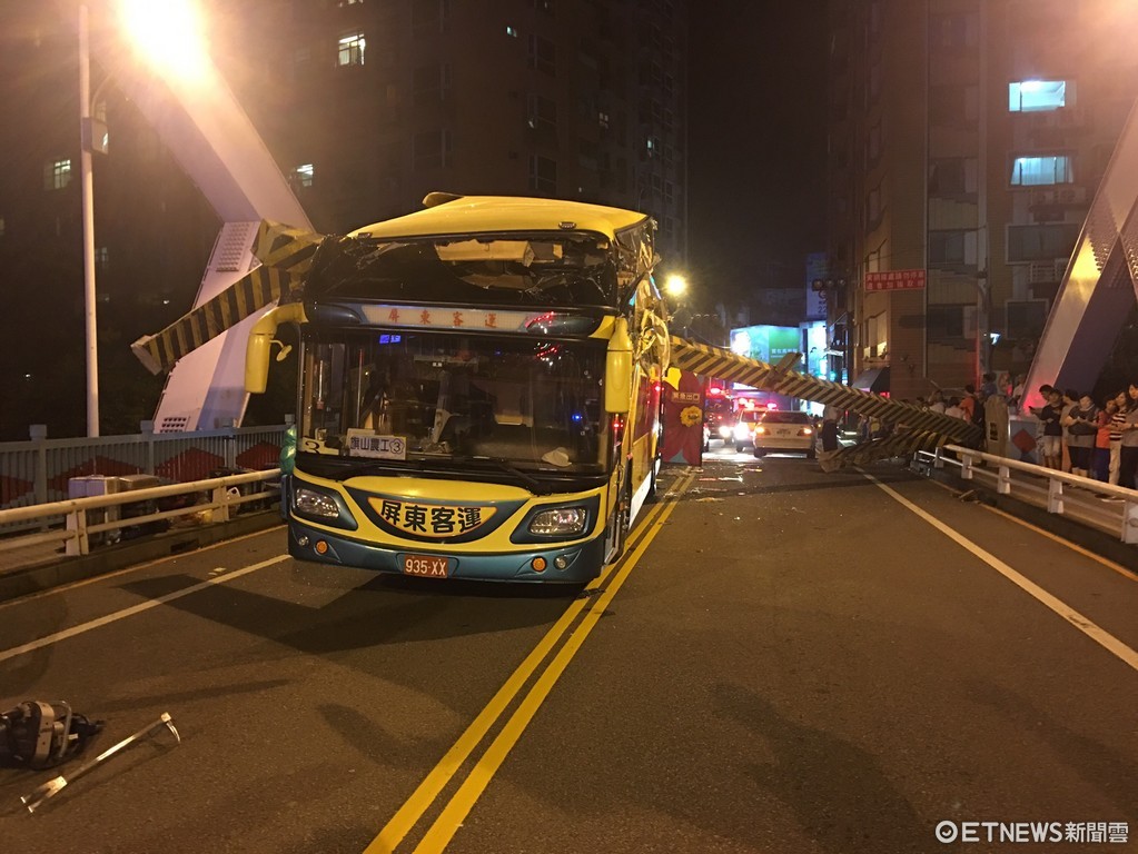 ▲屏東客運的遊覽車撞斷橋樑的限高橫樑,造成5名旗山農工的學生輕重傷。(圖/記者柳名耕翻攝/下同)