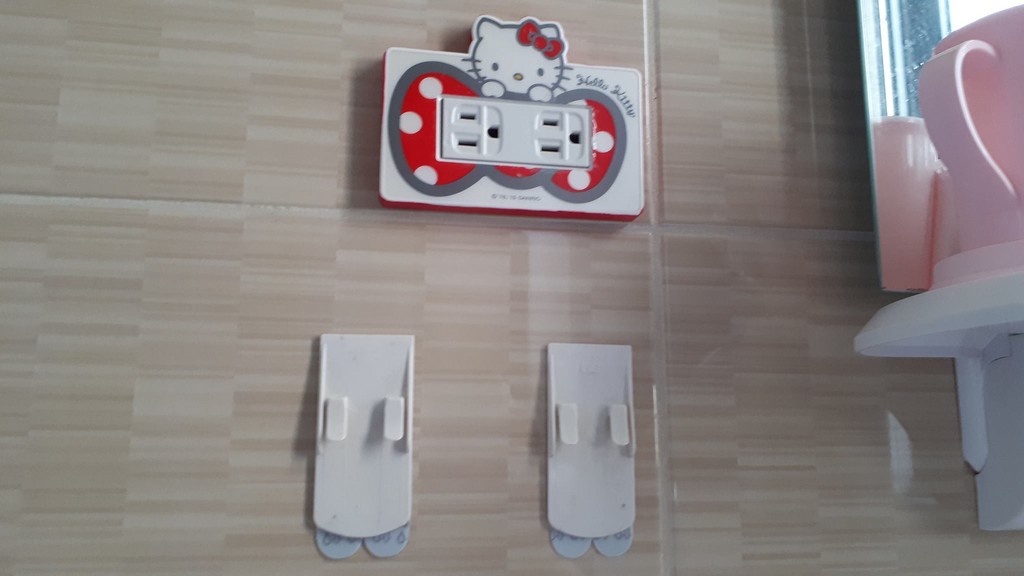 根據原PO貼出的照片,可以知道是在浴室裡,牆上有兩個插頭,外圍有可愛的Hello Kitty裝飾,下面是兩個無痕掛勾。有人一頭霧水說,「完全不知道亮點在哪,是你喜歡kitty貓嗎?」