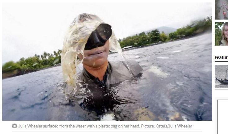 31歲潛水者茱莉亞(Julia Wheeler),在峇里島(Bali)訓練時,發現海上漂流3噸垃圾,形容景象像「真實世界的夢靨」,想趁「為時已晚」之前,呼籲大家一起改變。她說,「跟純淨的大海說再見!眼前盡是一片塑膠樂園,這就是證據。我看到海中的小魚在我面前吃起塑膠袋,甚至連烏龜也必須避過這些汙染物…」