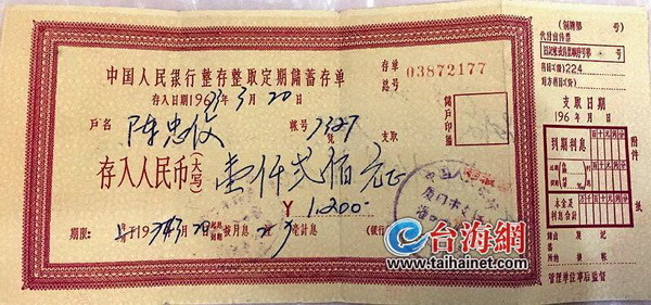 福建廈門50多歲的陳女士前幾天在家裡打掃時,無意中找出來一張44年前的中國人民銀行人民幣1200元(約台幣5488元)的定期存單,不過因當年的「中國人民銀行」早已改制,所有業務都歸併到其他銀行。經過一番奔波後,在廈門的人民銀行幫忙下,終於連本帶利取回人民幣2684.04元(約台幣1萬2千元)。網友就說,當年1200元簡直是巨款啊,估計可以蓋兩棟房子,但現在取回來的2684元,「只能租一間」。