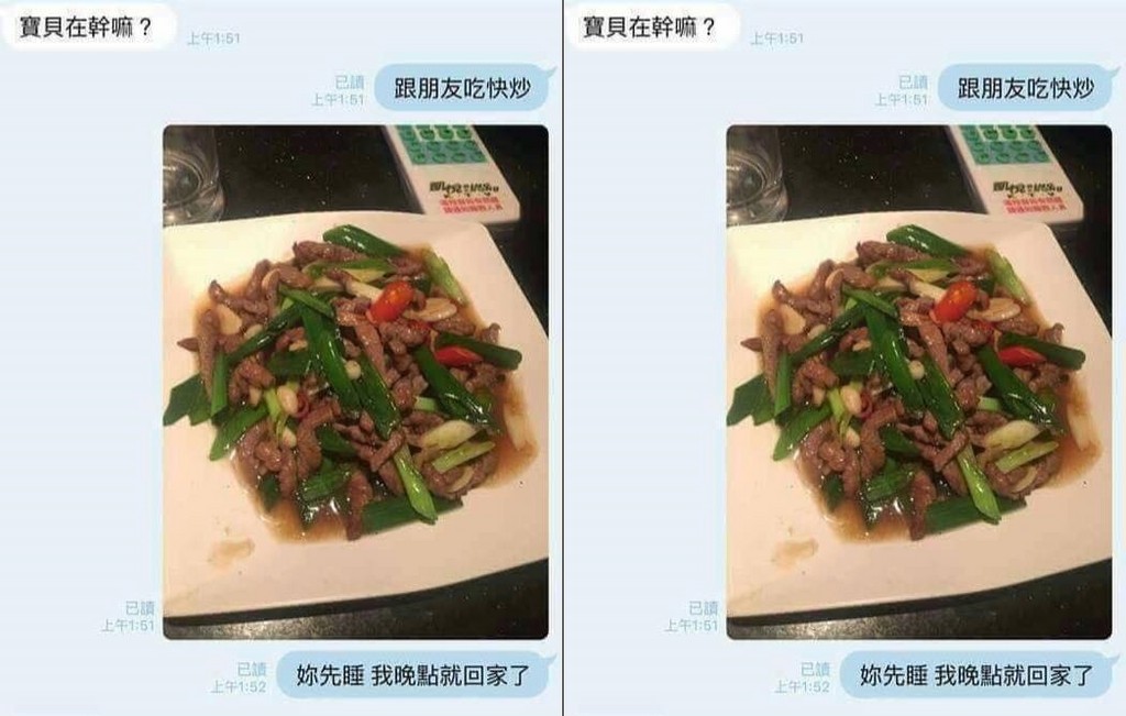 網友22日在「爆廢公社」發文,貼出一張Line對話截圖,內容是關於一對男女朋友,時間是凌晨接近2點。由於時間已晚,看男友遲遲還沒回家,女生決定傳訊息關心一下,「寶貝在幹嘛?」男友收到訊息,馬上回覆是在跟朋友吃熱炒,為了證明所言不假,還附了張蔥爆牛肉照片,「妳先睡,我晚點就回家了。」