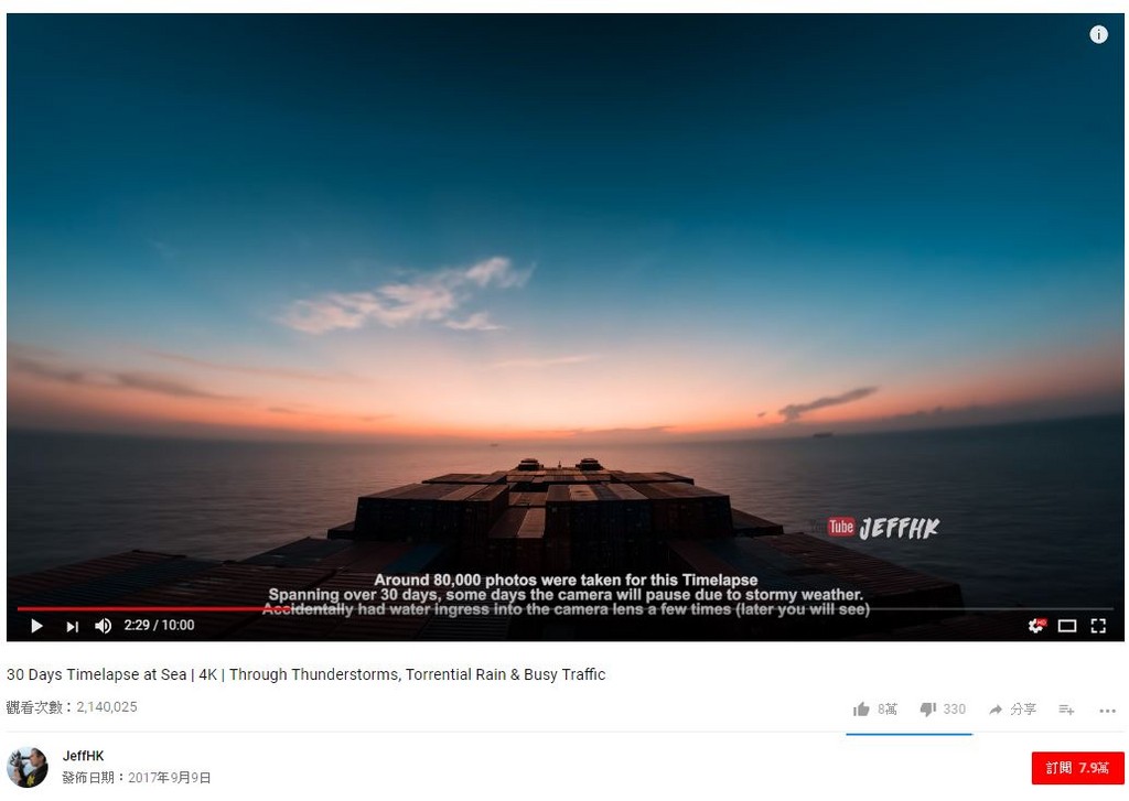 香港水手Jeffrey月初在Youtube上傳一段名為30 Days Timelapse at Sea的影片,全長十分鐘,以4k畫質拍攝,共拍了超過80,000張相片才合成一段10分鐘的影片。Jeffrey這一次的航線是由紅海出發,途經亞丁灣、印度洋、可倫坡、馬六甲海峽、星加坡、南中國海,到達終點站香港。